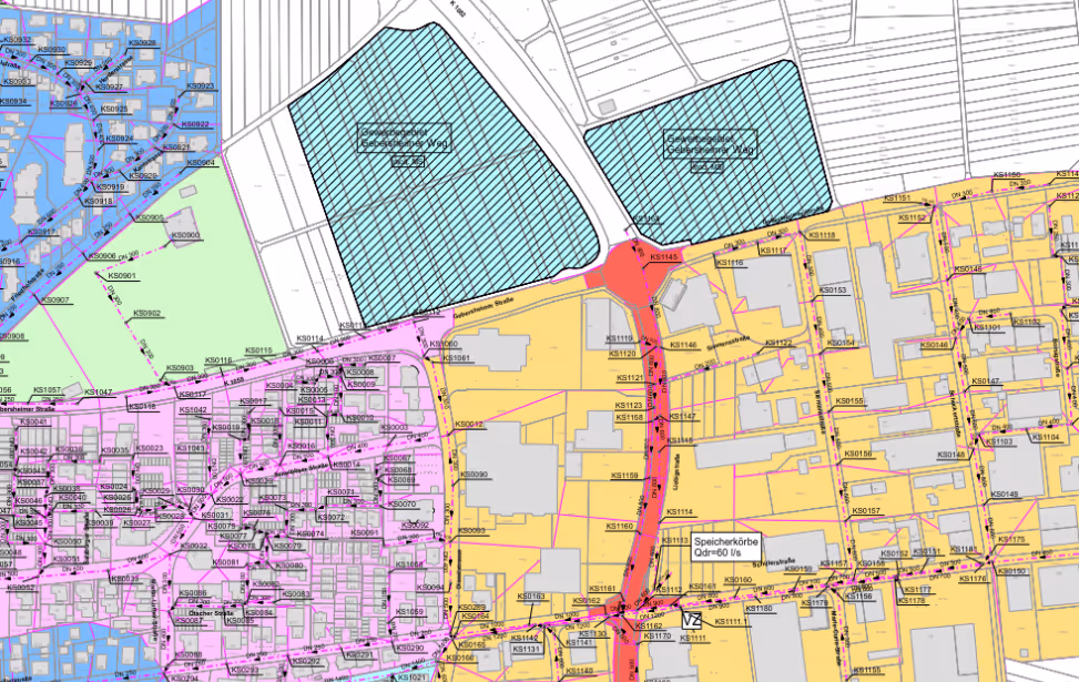 Erarbeitung und hydraulische Prüfung von acht Sanierungsbereichen: Gartenstraße, Haus der Kinder, Borsigstraße, Auf der Steige, Im Bonholz, Heimerdingerstraße und Lessingstraße
