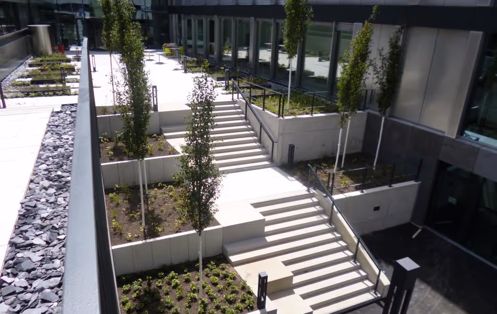 Die Firma MANN+HUMMEL GmbH hat sich entschlossen in Ludwigsburg ein neues Technologiezentrum zu erstellen.Mit dieser Maßnahme werden auch die Außenanlagen einschließlich Treppenlagen, Wege, Aufenthaltsflächen und die Bepflanzung repräsentativ hochwertig und gestalterisch anspruchsvoll neu hergestellt.