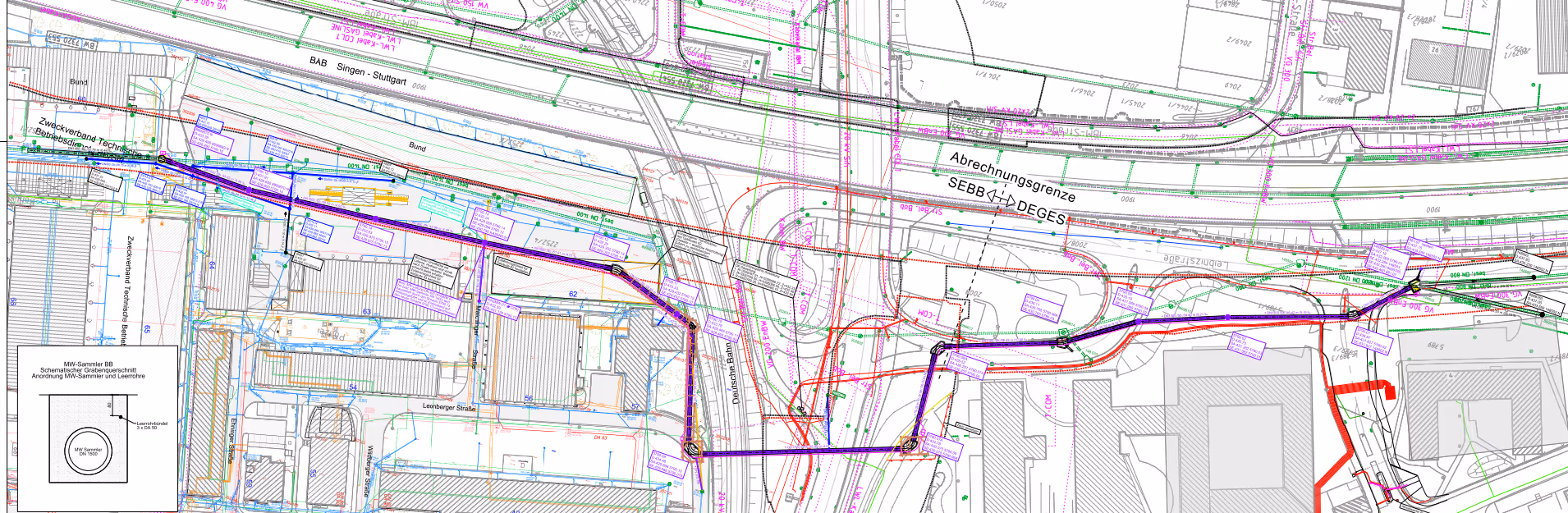 Die Abrechnung der ausgeschriebenen Leistung erfolgt in zwei getrennten Abschnitten. Für den östlichen Bereich der Kanaltrasse von Schacht 8999670.N bis einschließlich Schacht 5790.06A und der Rohrvortriebsarbeiten erfolgt die Abrechnung der Leistungen über den Eigenbetrieb Stadtentwässerung Böblingen (SEBB). Der westliche Abschnitt ab Schacht 5790.06A bis zum Anschluss an den Bestand bei Schacht 148502.N wird über die Stadt Böblingen mit der DEGES abgerechnet (s. Abschnitt 3.14).