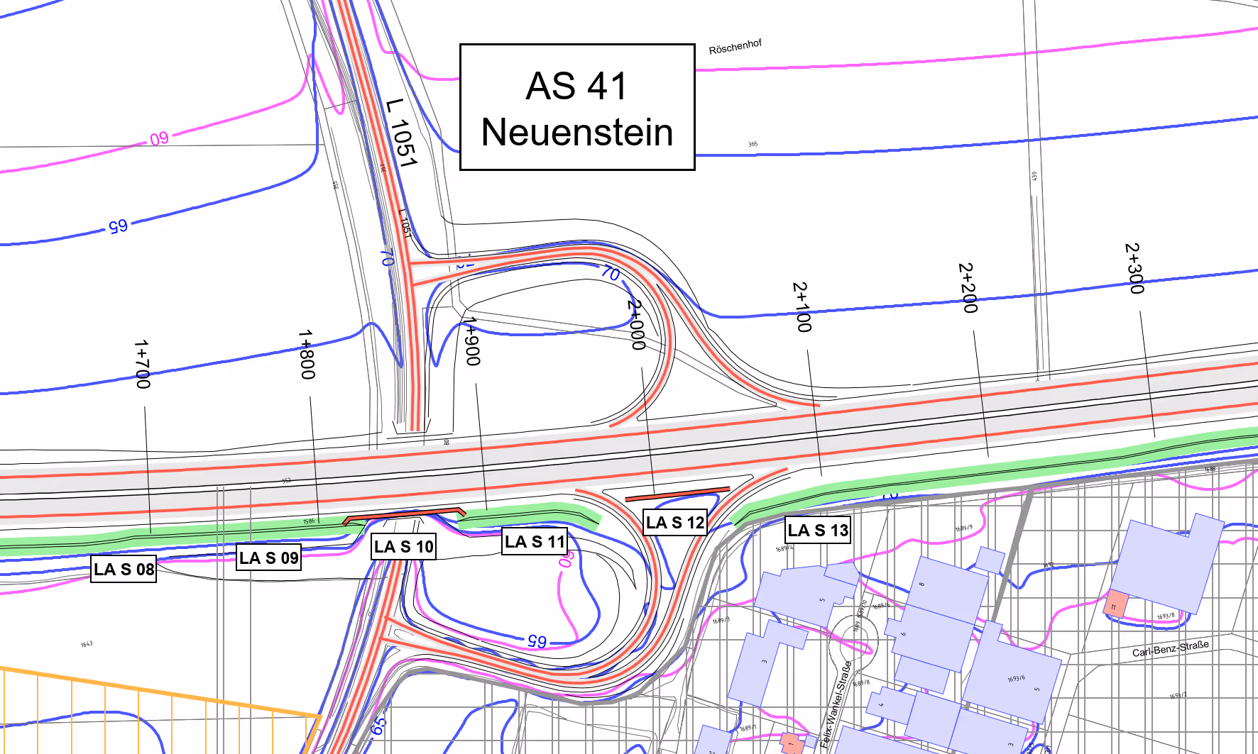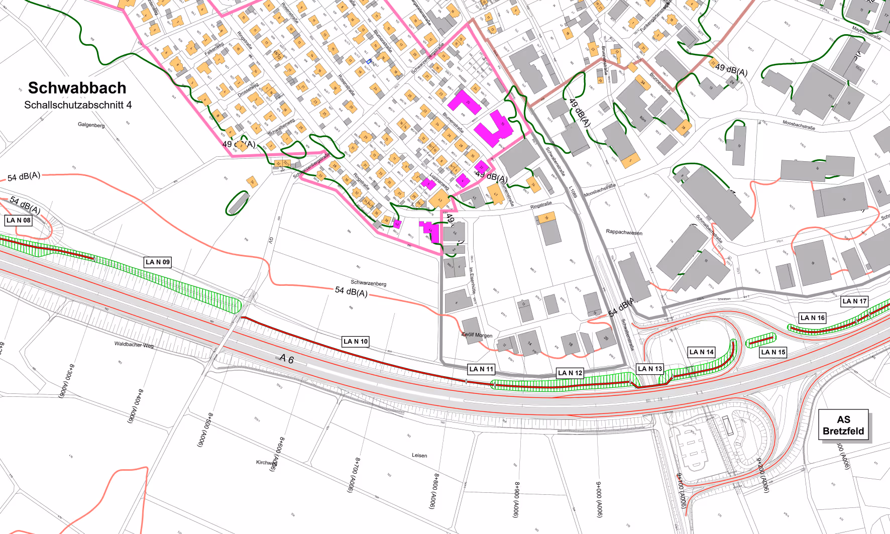 Im Rahmen der Planung für den 6-streifigen Ausbau der A 6 im Abschnitt 3 (Öhringen - Kupferzell) waren die Einwirkungen des Straßenverkehrslärms auf die Bebauung im Bereich der gesamten Baustrecke detailliert zu beurteilen.