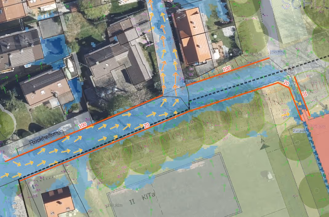 Risikoanalyse: Detaillierte Auswertung der Starkregengefahrenkarten, Risikobetrachtung und Erstellung von Risikosteckbriefen für öffentliche Gebäude.