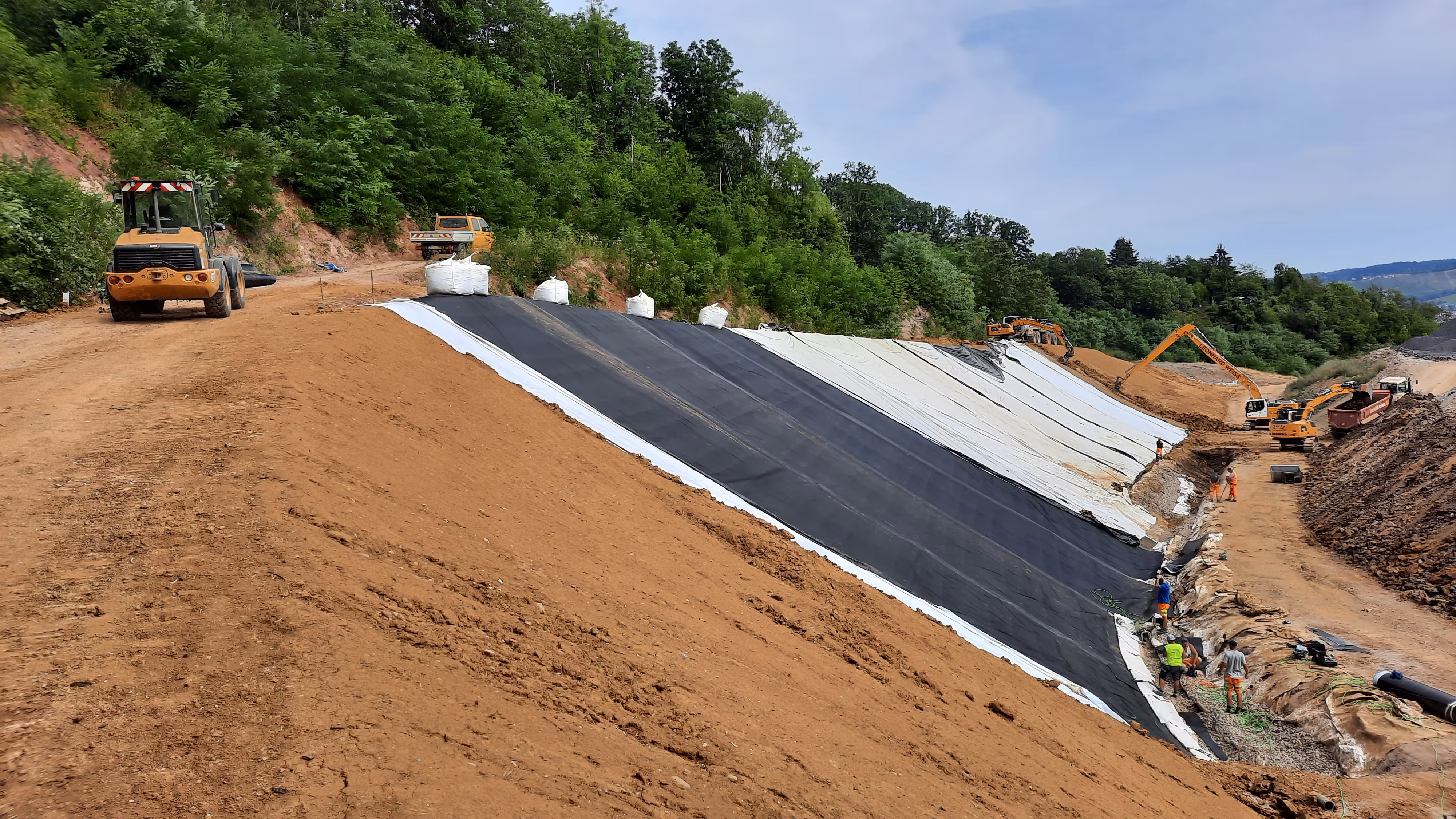 Ende 2021 wurde mit dem Bau der Oberflächenabdichtung begonnen. Nach dem Abtrag von Oberboden und verwertbarem Boden wurde eine Profilierungsschicht aus DK I Abfällen eingebaut. Der Aufbau der Oberflächenabdichtung besteht aus einer Trag- und Ausgleichsschicht (d = 30 cm), einer 2,5 mm dicken Kunststoffdichtungsbahn mit Schutzvlies, einer Entwässerungsschicht (d = 30 cm) und einer abschließenden 2 m dicken Rekultivierungsschicht, die später bewaldet wird. Als Erosionsschutz wurde auf die Rekultivierungsschicht eine Kokosmatte aufgebracht und zwischenbegrünt. Zur Ableitung von Oberflächenwasser aus der Entwässerungsschicht wurden Drainagen aus PE-HD, da 280 mit Anschluss an vorhandene Oberflächenwassergräben verlegt. Des Weiteren wurden zwei Sickerwassermesspegel im Bereich der Oberflächenabdichtung mit Durchdringselementen eingebaut.