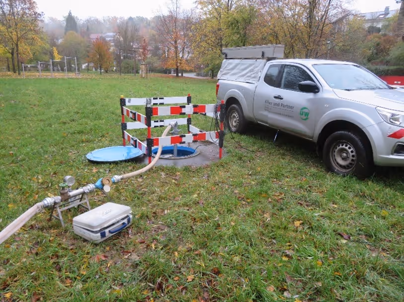 Die Klinger und Partner GmbH wird seit mittlerweile mehr als 10 Jahren mit der jährlichen Begutachtung und Funktionsprüfung der Stuttgarter Notbrunnenbeauftragt. Hierbei werden mehrstufige Pumpversuche durchgeführt, um die Ergiebigkeit der Brunnen und deren Betriebsbereitschaft zu untersuchen. Während den Pumpversuchen wird der Grundwasserspiegel kontinuierlich mit Drucksonden gemessen, per Datenlogger aufgezeichnet und im Anschluss hydraulisch ausgewertet. Die Wasserstandsmessungen werden zusätzlich von der Aufnahme diverser vor-Ort Parameter, wie z.B. Wassertemperatur und elektrische Leitfähigkeit, begleitet. Des Weiteren erfolgen regelmäßig Probenahmen, um den Chemismus des geförderten Grundwassers zu bewerten.