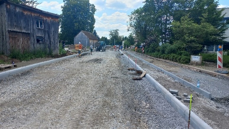 Im Zuge des Ausbaus wurde die Straßenachse und insbesondere die Gradiente optimiert und angepasst, um eine funktionierende Entwässerung der Straße umzusetzen. Hierbei galt es die vielen verschiedenen Zwangspunkte, insbesondere bestehende Grundstückszufahrten und HQ100-Bereiche zu beachten. Zukünftig erhält die Industriestraße eine 6,5 m breite Fahrbahn mit einem einseitigen 1,5 m breiten Gehweg. Durch die unmittelbare Nähe der Maßnahme zu einem Bahnübergang der Wieslauftalbahn musste die Planung und Ausführung mit dem Bahnbetreiber abgestimmt und die Einmündung der Industriestraße in die Buhlbronner Straße entsprechend gestaltet werden.