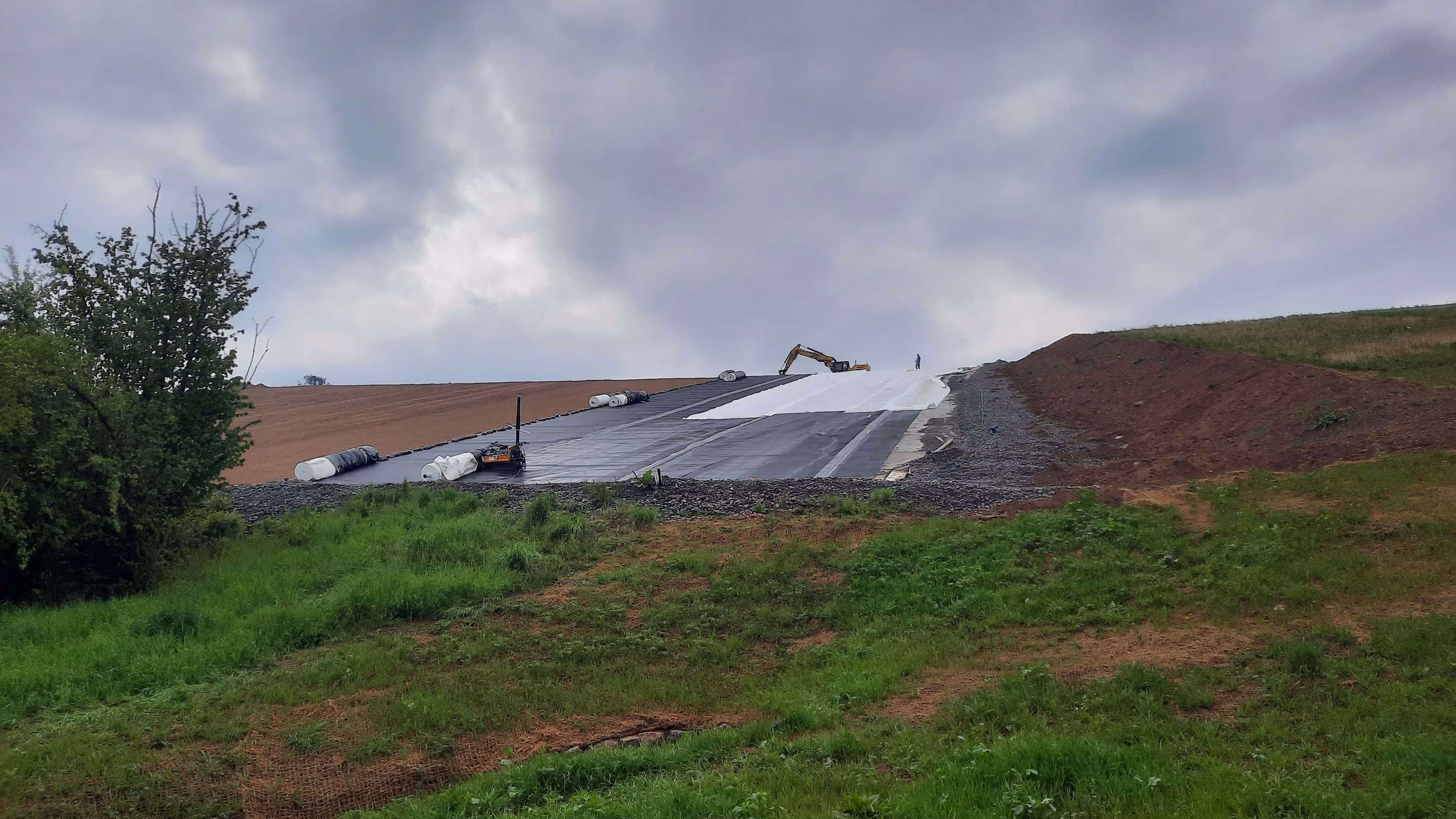 - Verlegung von Kunststoffdichtungsbahn (Dicke = 2,5 mm) mit aufliegendem Schutzvlies (ca. 40.000 m2)
