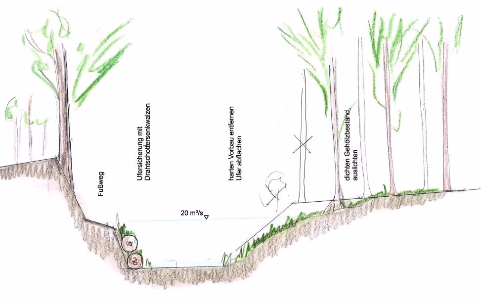 Durch Abflachungen der Vorländer wurden Ausuferungsbereiche und Retentionsräume geschaffen und durch eine Auflockerung der Linienführung mit mäandrierendem Verlauf eine Verlangsamung der Abflussgeschwindigkeiten erwirkt, die zur Reduzierung der hydraulischen Belastung und Erosionen des Flussbetts führen.