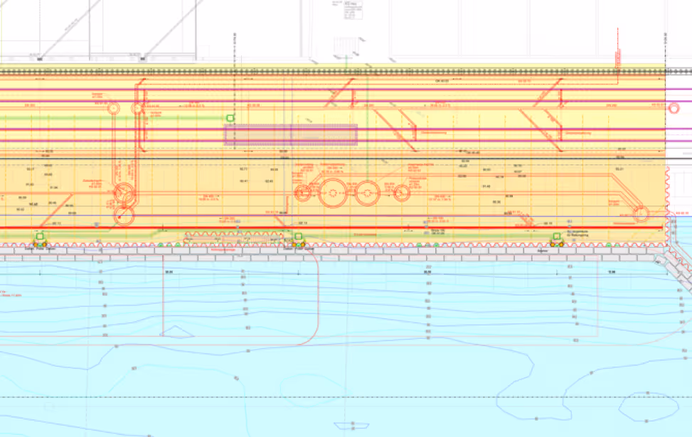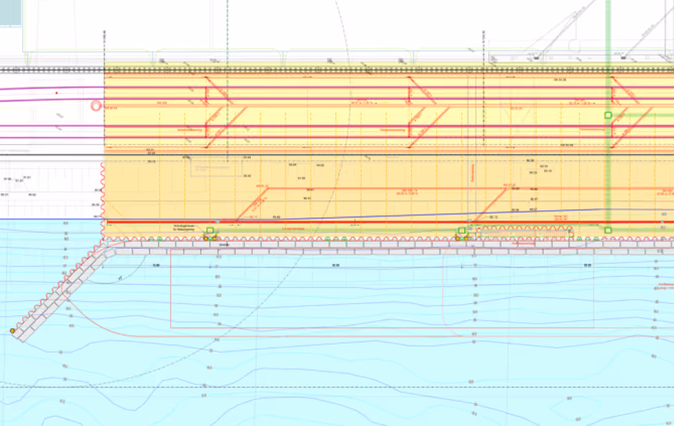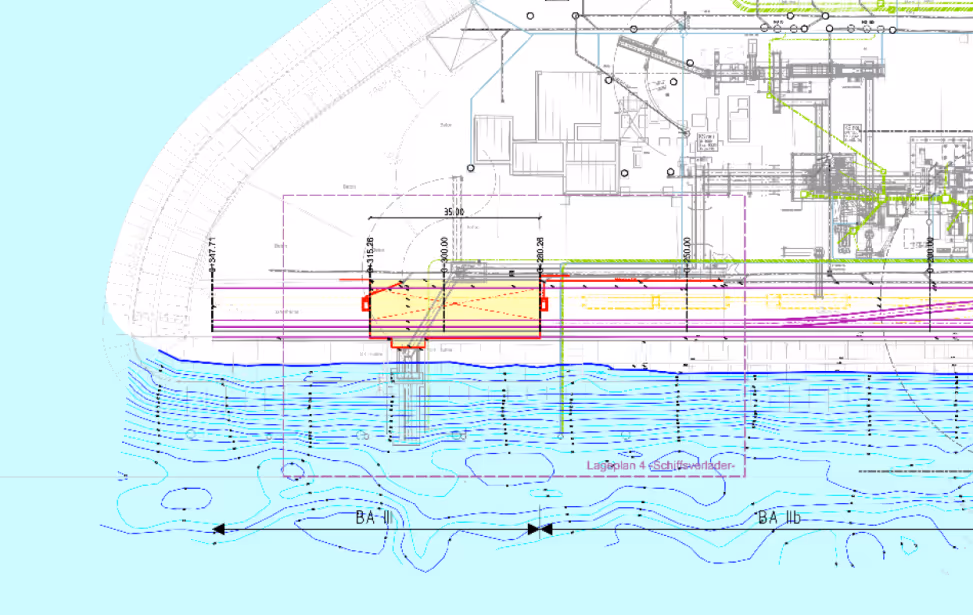 Zur Optimierung der Verladung der Schiffe wurde wasserseitig eine Spundwandnische, Länge ca. 135 m, für Schiffe der Klasse 5a in die vorhandene Uferböschung geplant. Hierzu müssen Stahlspundwände, Länge ca. 12 m – 13 m, inkl. teilweise zweilagiger Verankerung mit Daueranker hergestellt werden. In die Spundwand wurden zur Evakuierung des Schiffspersonals Treppenanlagen integriert. Ebenfalls müssen Schiffsfestmacher angebracht werden. Die stark beschädigte Gleisanlage musste auf einer Länge von ca. 400 m komplett zweispurig inkl. Weichen geplant und erneuert werden.
