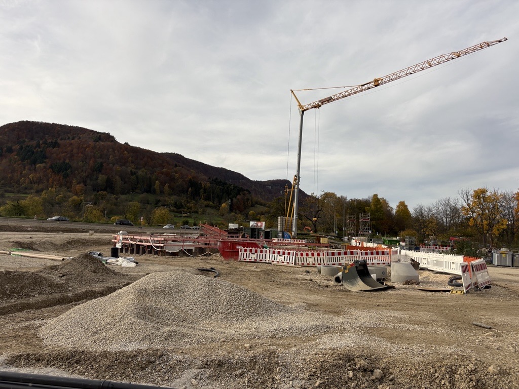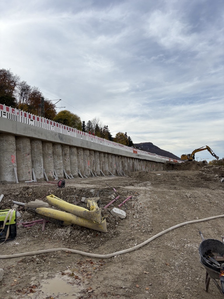 Da sich die Maßnahme im Wasserschutzgebiet (Zone II und IIIA) befindet, wird das Straßenabwasser künftig über zwei Filteranlagen gereinigt. Aktuell: Die Bohrpfahlwand im Bereich „Hochhaus“ wird hergestellt, während im Bereich „Wasserfall“ an der ersten Filteranlage sowie an den Tiefbauarbeiten gearbeitet wird. Der Verkehr läuft über eine Behelfsfahrbahn.