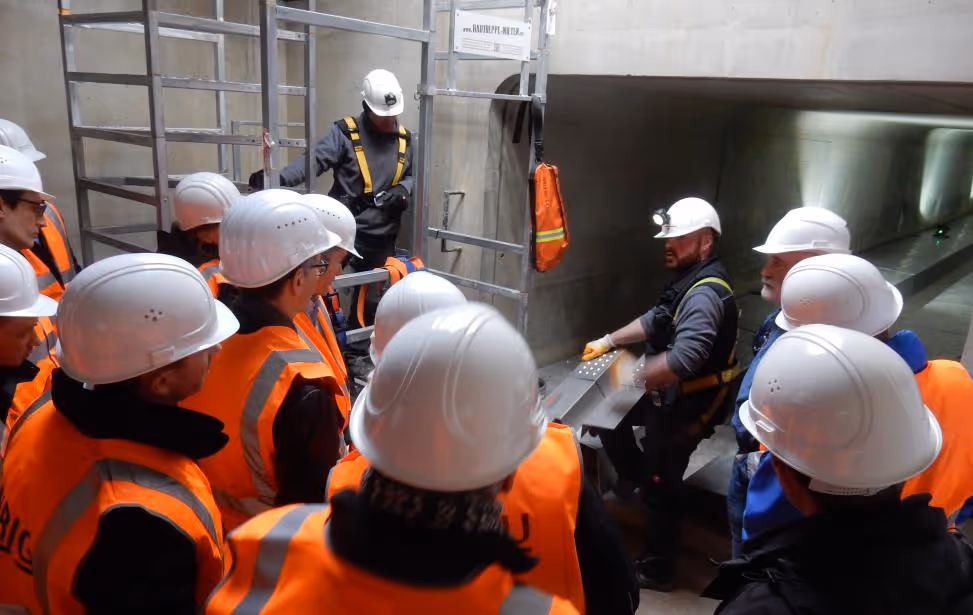 Die Diskussionsrunden und Pausen dienten allen Teilnehmern und Referenten dem intensiven Dialog und vertiefenden Fachgesprächen. Im Block nach der Mittagspause wurde das Leuchtturmprojekt „Abwasserwärmenutzung Neckarpark“ in mehreren Fachbeiträgen detailliert vorgestellt. Die Klinger und Partner GmbH hat bei diesem Projekt die Landeshauptstadt Stuttgart in allen Belangen der Abwasserwärmenutzung beraten, den Wärmeentzug geplant sowie die örtliche Bauüberwachung erbracht. Nahezu 50 Teilnehmer haben zum Ende der Veranstaltung die seltene Gelegenheit genutzt, die Baustelle und nach einem Einstieg die Wärmetauscher im Kanal zu besichtigen.