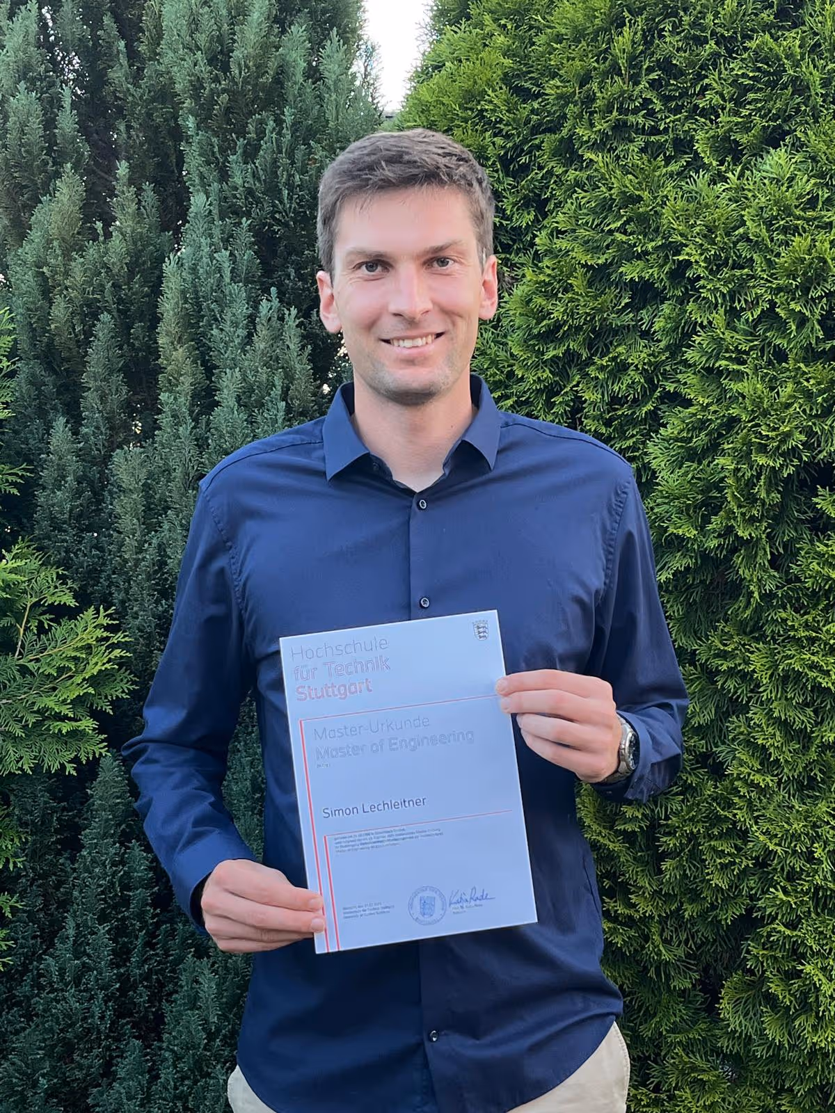 Wir gratulieren unserem Kollegen Simon Lechleitner herzlich zum erfolgreichen Abschluss seines Masterstudiums in Kooperation mit KuP in Verkehrsinfrastrukturmanagement an der Hochschule für Technik Stuttgart!
