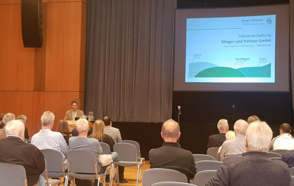 Unter Mitwirkung der Klinger und Partner GmbH führte die Stadt Wernau (Neckar) am 11. Oktober 2019 für alle interessierten Bürger eine Infoveranstaltung zum Thema Starkregenrisikomanagement durch. Vorgestellt wurden die Starkregengefahrenkarten, die für die Stadt Wernau im Zuge des Starregenrisikomanagements des Landes Baden-Württemberg erstellt wurden. Diese Studie enthält Maßnahmenempfehlungen für die Stadt, die zur Minderung von Starkregen bedingten Überflutungen führen.