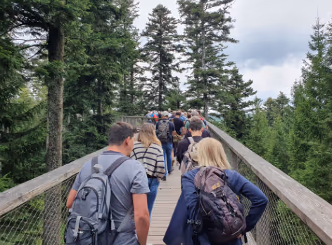 Nach dem Mittagessen vor Ort führte uns der Weg weiter nach Bad Wildbad, wo wir gemeinsam den Baumwipfelpfad erkundeten. Auch wenn uns pünktlich zur großen Rutsche der Regen erwischte, ließen wir uns die Laune nicht verderben. Es ging nach einer kurzen Regendusche weiter zur gemütlichen Saustalhütte wo Kaffee und Kuchen schon auf uns gewartet hat. Zuletzt ließen wir den Tag beim Abendessen im Restaurant Rössle in Calw entspannt ausklingen, bevor es mit dem Bus wieder zurück zum Standort Stuttgart ging.