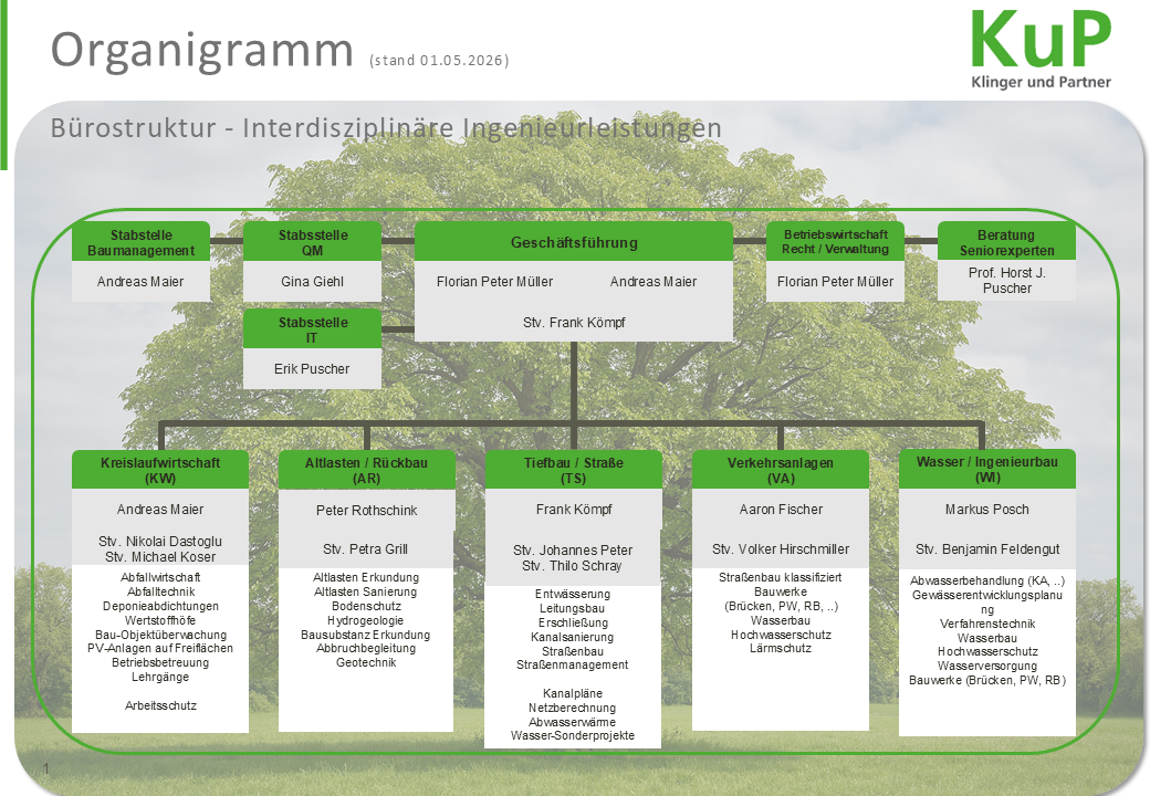 Die Klinger und Partner GmbH besitzt ein aktiv gelebtes Qualitätsmanagementsystem. Eine erstmalige Zertifizierung nach DIN ISO 9001: 2015 erfolgte für die UW Umweltwirtschaft GmbH bereits im Jahr 1995. Durch ein externes Audit wurde diese zum 21.03.2012 auf die Klinger und Partner Ingenieurbüro für Bauwesen und Umwelttechnik GmbH (KuP) überführt. Seit dem Jahr 2022 ist KuP Mitglied im Qualitätsverbund Planer am Bau. Unser Qualitätsmanagementsystem bildet die Basis für die kontinuierlichen Verbesserungsprozesse in unserem Unternehmen.